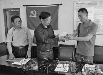| 李军(右)将30万元支票交到兖州市志愿者协会会长龚方手中。