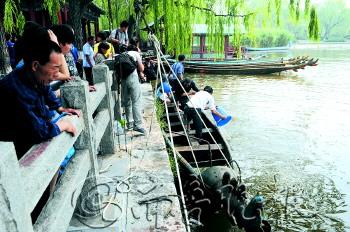 5月14日,济南大明湖公园,工人们将十几只龙舟从湖底打捞出来,预备维修,备战今年的龙舟赛。这些龙舟在湖底已经呆一年了。