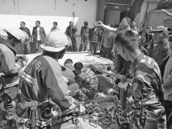 救援人员到达现场后得知,事故发生时有两名工人被困,一名工人在救援人员到达现场前已被村民救出,另一名工人还埋在废墟下。压在被困工人上方的是一块4米×5米、厚度15厘米的水泥板,重约3吨。由于事发地点在农村,道路狭窄,大型吊车无法靠近现场。指挥员与在场的兰高派出所民警商量后,救援人员分成两组,一组在倒塌平台的北面使用千斤顶,另一组将砖块摞成4摞,又从废墟中挑选出4根强度较高的木板,将木板伸入坍塌的空隙中,另一头搭在摞好的砖块上,利用杠杆原理将3吨重的水泥板撬起,一名身材较小的救援人员爬进倒塌平台内,将被困工人成功救出。