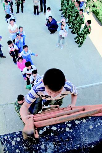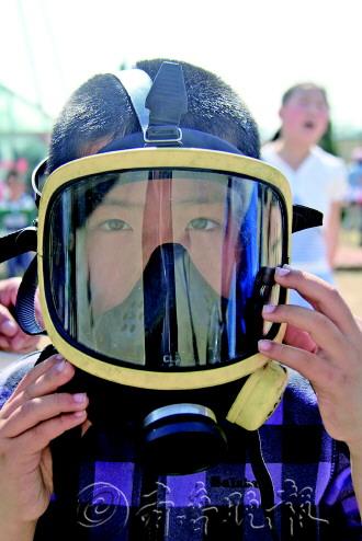 通讯员 赵璠 摄 |  | ◥小记者在学习如何佩戴防毒面具。 记者 王震 通讯员 赵璠 摄 |  | ◥参加活动的小记者在体验攀爬云梯。