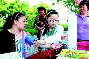 16日上午,在新华路东风街路口北侧,新华路中社区组织的“夏日送健康”免费义诊活动拉开帷幕。活动现场,过路市民可以免费测量血压、免费问诊。据了解,通过此次活动,不仅可以让市民享受免费查体,更重要的是向他们宣传健康卫生知识,提高自我保健意识。        本报记者 吴凡 摄影报道