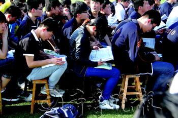 | 高考来临,一所高中的高三学生在参加毕业典礼大会时抽空学习。 本报记者 刘涛 摄 |