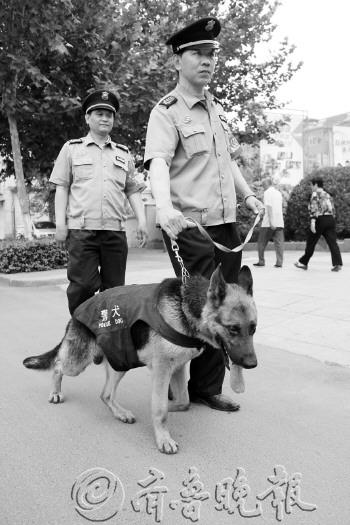 ◤近日,德城公安分局保安大队派出护卫犬巡逻组,每天在城区各金融网点、景区广场等地不间断巡逻。 本报通讯员 李丽丽 摄