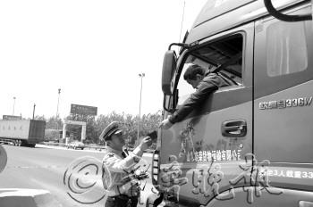 ▲6月2日,德州市交警支队高速公路一大队对辖区内进入山东的客、货运车辆进行检查,全力保障高速道路交通环境。 本报通讯员 马振华 摄
