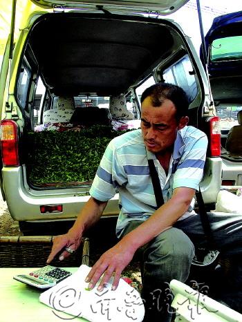 | 一位鲜叶收购商计算后说,炒茶的利润比上一周降低了一半。 本报记者 李清 摄 |