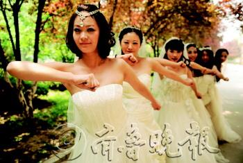 6月1日,聊城大学音乐学院09级1班的几位女生身穿婚纱在校园里拍毕业照,以此来纪念四年的大学生活。她们是同一个宿舍,毕业以后不知道六个人什么时候还能聚在一起,就算将来有机会重聚,也不会像现在一样年轻了,希望留下青春的回忆。