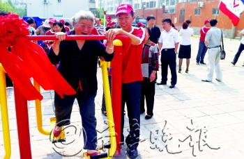 | 在安利志愿者的帮助下,小区里的老人踩在新健身器材上,乐歪了嘴。