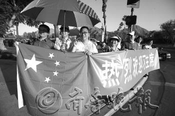 | 当地时间6月6日傍晚,习近平下榻的凯悦酒店旁边,当地华人举起国旗和横幅迎接。
