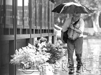 7日,84岁南京人汪侠冒雨参加高考。 中新社发