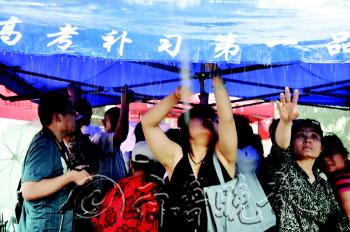 | 高考考点外,出现“保送本科”的小广告。 本报记者 李娜 摄 |  | 7日下午突降阵雨,家长们赶忙到遮阳棚下躲避。左庆 张凯翔 摄 |  | 在历城二中附近的餐厅内,午饭后考生趴在餐桌上休息。