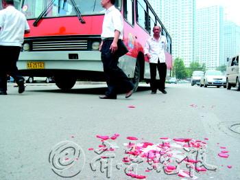 | 轿车尾灯碎片撒了一地,公交车还停在路边。 吴金彪 摄 |