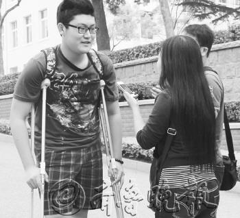 7日中午,在16中考点,66中考生马源哲拄着拐杖走出考场。一个月前不小心崴了脚,马源哲只好打着石膏上考场。 吕璐 姚雷鸣 摄