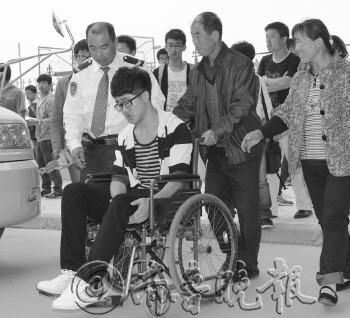 7日,在莱西一中北校,一名坐轮椅的考生在莱西市开发区校车驾驶员的护送下进入考场。 崔克臣 摄