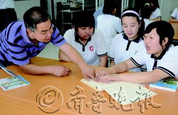 7日,本报张刚大篷车来到市特教中心,和爱心单位一起为这里的孩子送来了千余本图书,建起爱心图书室。图为本报张刚大篷车负责人张刚(左一)和孩子们共读盲文书。 本报记者 姜文洁 摄