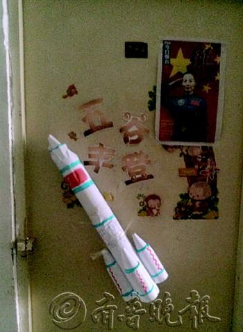 本报6月11日讯 11日,烟台大学南校区九号楼北区331宿舍“出名了”,门上齐鲁晚报·今日烟台报纸头版和一个逼真的飞船模型吸引了很多人的目光。“我们是从齐鲁晚报·今日烟台上看到烟台姑娘王亚平即将飞天的消息,就做了这个飞船的模型。”该宿舍大一学生侯宪腾指着门上张贴的报纸说,“看了好几份报纸的头版,就觉得齐鲁晚报·今日烟台的头版最好看!” “模型做完的时候,我觉得很有成就感。中国的科技人员建造真的飞船比这难多了,中国真的越来越强大,我为祖国感到骄傲!”侯宪腾告诉记者,他自己也有一个飞天梦,希望自己也能去太空走一回。