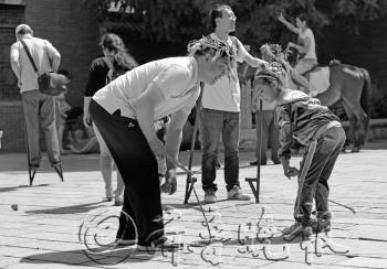 | ▲周村古商城内,游客正头戴艾叶帽玩陀螺。 本报通讯员 张红霞 摄 |
