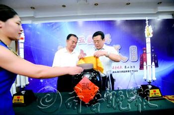 | 中国航天基金会秘书长张玉江(左)与泰山酒业集团董事长马西元共同为中国第一太空酒“神十飞天纪念酒”酒样封坛。 本报记者 左庆 摄 |