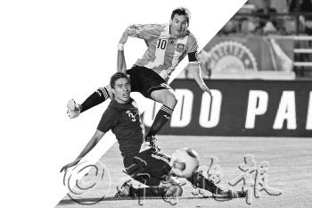 | ◥6月14日,在国际友谊赛中,阿根廷队以4:0战胜危地马拉队,梅西上演帽子戏法。图为梅西(上)在比赛中。 新华社发