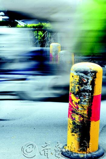 | 一个隔离桩被撞得伤痕累累,而它也“暗算”了不少行人。 本报记者 王媛 摄 |