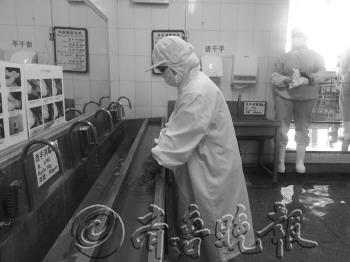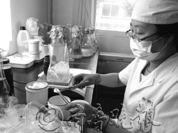 | 检测人员正在对葱末进行微生物检测。 |  | 手套要消毒,靴子也要在地面的消毒池里消毒。 |