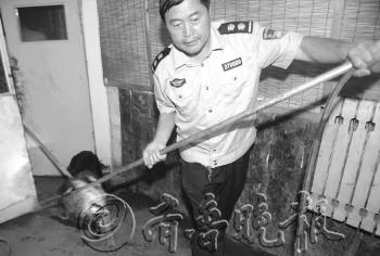 | 执法人员在一烧烤摊主的住房里擒获烈性犬。本报记者 戴伟 摄 |