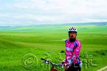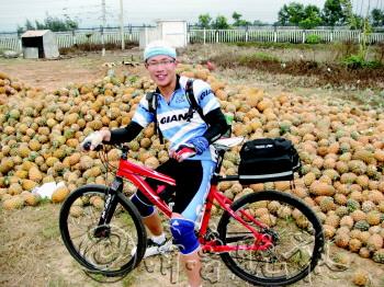 | ▲徐鹏程去年2月单车环游海南岛时,与刚收获的菠萝合影留念。 |  | ◥徐鹏程去年7月骑单车环游青海湖。 受访者供图 |