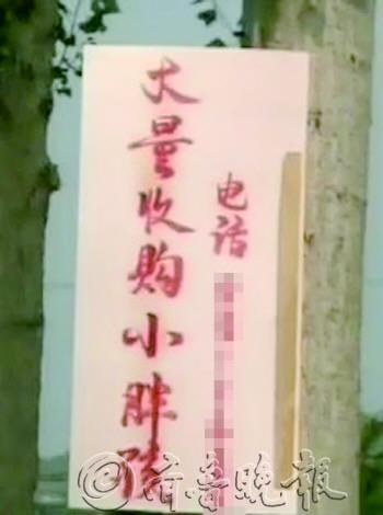 本报6月19日讯(记者 侯艳艳) “大量收购小胖孩”!近日,在栖霞市观里镇,这样一则广告牌吓到了不少过路人。有人想公然贩卖小孩?19日,记者采访获悉,“小胖孩”是一种虫子的俗称,附近饭店为收购这种虫子才打出这样的广告。 市民李先生日前路过栖霞市观里镇时,在公路上看到一则广告,广告牌上赫然写着“大量收购小胖孩”几个大字,旁边还留下了联系电话。“看到这个广告,我真的吓了一跳!”李先生说,他的第一个念头是“有人想贩卖小孩”。 “不单是我,很多过路人看到这个广告牌,都停下来询问情况,有村民甚至想报警。”李先生说,一个抱着孩子的大姐看到广告牌,吓得惊叫起来,但也有市民认为,想收小孩不会这么明目张胆,可能是一种东西叫“小胖孩”。 19日,记者拨打广告牌上的电话联系到悬挂广告牌的饭店老板。据介绍,所谓的“小胖孩”实际是一种叫蛴螬的虫子,当地也有人把这种虫子叫香油虫。这家饭店是专门做野味的,饭店用“小胖孩”这种虫子做菜已有多年。 “这种虫子炸着吃特别香,属于高蛋白食品。”老板说,由于这个菜销量好,饭店供不应求,所以他才在公路边挂上广告牌收购“小胖孩”,没想到带来这么多误会。老板说,他会将这个广告牌摘掉,以免让更多人误解。