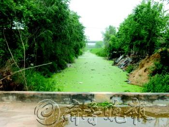 18日,德城区二屯镇后赵庄村村东一条水渠,由于富营养化,水面完全成了绿色,水上还漂浮着大量的生活垃圾。 本报见习记者 张建业 摄