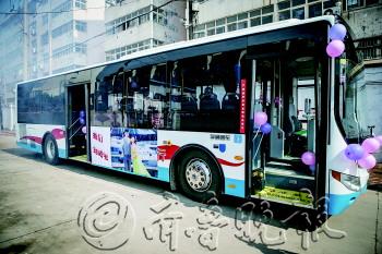 19日上午,一辆“装扮一新”的公交车在石臼街头驶过,车头上绑着气球等装饰物,车身上则印着一对新人的写真照片。新郎刘振说,他和妻子希望婚礼能留下不同的回忆,所以决定从公交公司租了一辆公交车当作婚车。