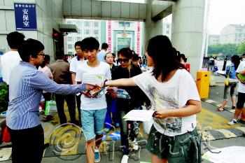19日上午,在淄博实验中学中考的学生们刚出校门,手里就被塞满了各种宣传单页,不少学生和家长颇为反感。当天在该校附近搭起帐篷的培训机构有五六百米长,有的堵在考点门口“工作”,影响考生进出。 本报记者 王鑫 摄