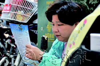 | ▲19日下午,在淄博五中考点外,一名家长正在看招生宣传单页。