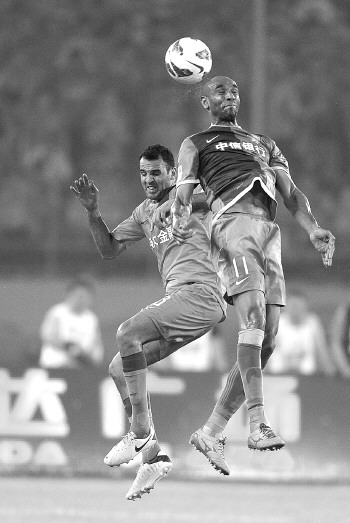国安外援卡努特与鲁能外援安塔尔争抢头球。新华社发