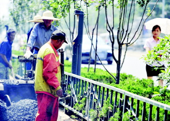 据了解,由于和平路修路,为了缓解周边道路的交通压力,他们必须在当日傍晚时分铺设完第二层沥青,完成该路段的临时通车。他们脚下的沥青温度高达100℃~140℃,踩在上面时间长了就烫得直跺脚,而他们的布鞋底上沾满了厚厚的沥青,算是暂时“隔热”了。工人们从早上7点开始工作,中午只休息了一小时。一天中最热的时候,他们依然奋战在炙烤的路面上。 本报记者 王媛 摄影报道