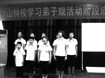 24日,微山县特殊教育学校举办诵读《弟子规》展示活动。本次诵读活动包括两个智障学生组、两个听障学生组和五个教师组,各小组均有具体的诵读章节。图为诵读活动现场。 本报记者 汪泷 本报通讯员 鹿崇涛 摄