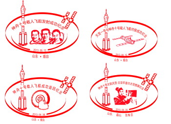 据了解,神十飞天期间,烟台集邮联谊会在烟台市邮政局备案的情况下,委托山东济南的资深邮品设计专家任怀平设计了8枚纪念邮戳和1枚宣传邮戳在烟台启用,其中两枚神十落地邮戳于26日中午12点在烟台启用。烟台集邮爱好者王革,也设计了4枚纪念邮戳和4版信封。