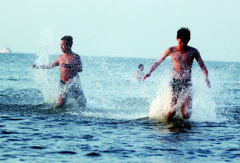 26日傍晚,高温天气下市民在第一海水浴场戏水乘凉。 见习记者 韩逸 摄