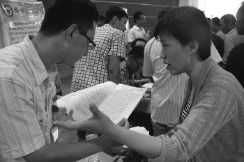 李春泉一大早就从昌邑开车带着两个表妹王慧芳和林晓敏来到高招会现场,他陪着两个表妹仔细地咨询每一个与会的高校。每咨询完一个展台,李春泉就会停下来与姐妹俩讨论一下刚才咨询高校的问题。李春泉告诉记者,他希望妹妹们能够考虑天津的一些高校,因为他在天津自己开了家网络公司,如果妹妹们能够来天津上大学,他也方便照顾她们。