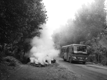 25日,在安丘市凌河镇南郚村和坝洼村之间,一位环卫工人将堆放在路边将近1米多高的麦秸堆焚烧。烟雾蔓延了整个路面,挡住了来往行人的视线。记者观察到,从此处经过的有不少客车和小型汽车。而据环卫工人称,不燃烧麦秸,路面就不好打扫。