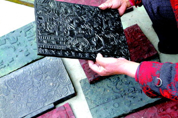 ◥一幅年画成型往往需要三到五块不同颜色的拓版。