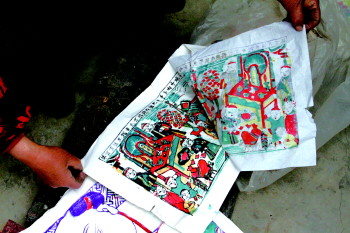 今年5月11日,在东港区首届非遗展上,薛桂香展示了印刷年画的流程。薛桂香先用棕制蘸子从颜料盆中蘸取颜料,然后放置于颜料盘中,再用蘸子在版上均匀刷色,之后将印纸敷于印版上抻平,用搪子擦压到位,揭起,一种单色的年画,就印刷完成了。