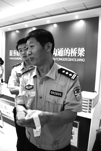 西城区交警大队张长玉大队长向记者介绍他们为学生制作的荧光带。