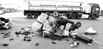 19日13时许,沾化县公安局交警大队接到群众报警:在辖区西外环附近,三车相撞,有人受伤。接到报警电话后办案民警立即驱车赶往现场,到达现场后办案民警立即对现场进行保护,防止二次事故的发生。经过对现场的勘察及当事人的询问,原为两货车相撞,殃及三轮车无辜受牵连。