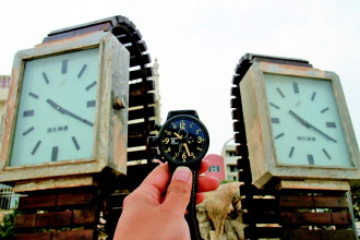 25日,在国际海水浴场管理处,两个手表形态的大钟相对而立。两个钟的显示时间均为10时20分,而此时北京时间为10时27分。