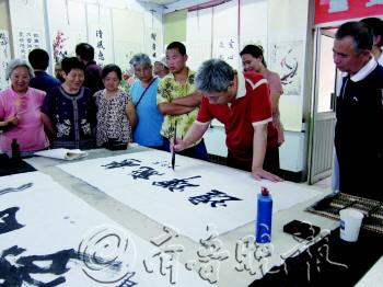 27日,新湖街道办事处康乐社区举办社区书画展,活动现场不少老年书画爱好者提笔写字作画,一展风采。 本报记者 孙婷婷 摄