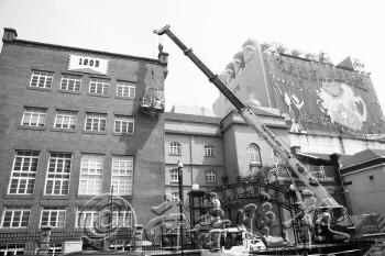 26日上午,位于登州路的青岛啤酒博物馆正在进行外墙面的修补。据介绍,墙面所贴的瓷砖因受潮造成部分脱落,工作人员正抓紧修补,以迎接即将到来的旅游高峰。        本报见习记者 姚雷鸣 摄影报道