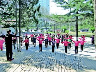 | ▲西门外社区居民在骆驼公园练习第九套广播体操 |