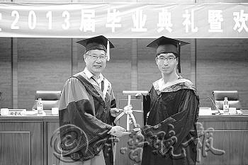 | 在毕业典礼上,彭实戈院士(左)与学生合影。 |