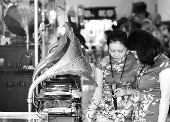 | ◥身穿旗袍的工作人员在推介复古款式的留声机。