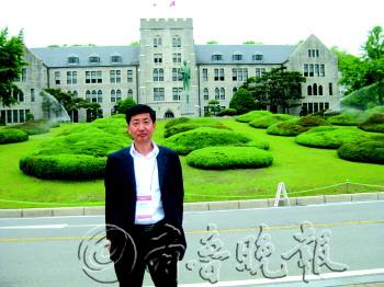 林明鲜:是的。我对比了日本和韩国,日本人在中国定居的很少,而韩国人很多定居在中国,烟台也是这样。中日韩三国文化上差异最大的是日本。中韩之间相似的地方很多,中日之间不同的更多。我们调查了解到,很多韩国人喜欢烟台这个城市。山东的城市为什么关注朴槿惠访华?因为政治很重要,两国间民间的友好都会受这个影响。 2012年5月12日,林明鲜在韩国高丽大学参加东亚文化交涉会议时所摄。 受访者供图