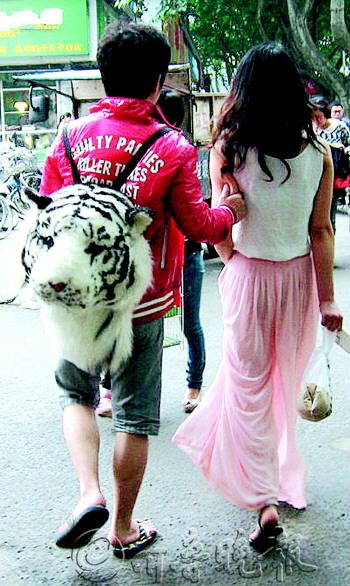 自述:帅哥背着个老虎包。